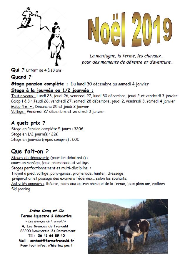 Il est maintenant possible de fixer des cours particuliers ou collectifs avec Emilie Gérardin et Pauline Dautrey. Les cavaliers non propriétaires de chevaux peuvent louer un cheval ou poney à la ferme grace à leur carte. (Demander à Irène pour plus de renseignements)